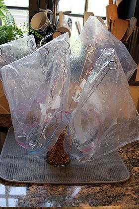 - 씻은 지퍼백을 뒤집은 상태로 입구를 막대에 걸어둔다